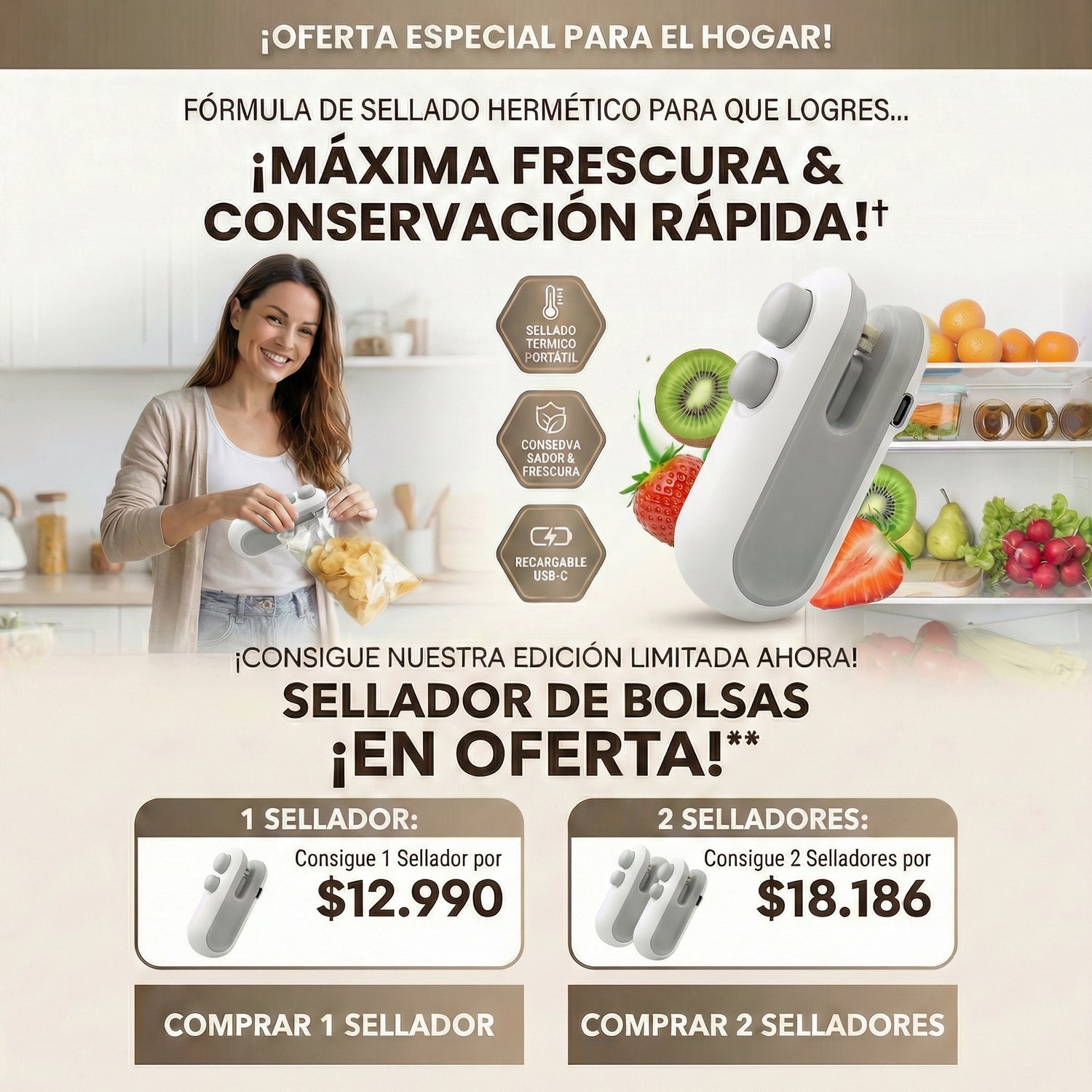 Corta y sella con el mismo dispositivo, ahorrando espacio y simplificando tu vida diaria.