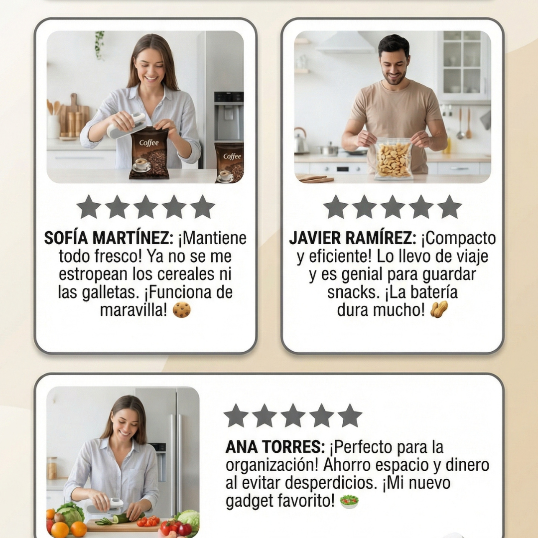 "Harta de los clips, probé este sellador y me encantó. Calienta rápido, sella hermético y corta de forma limpia. Al ser recargable por USB ahorro en pilas, y el imán para el refrigerador lo mantiene siempre a la mano. ¡Totalmente recomendado!"